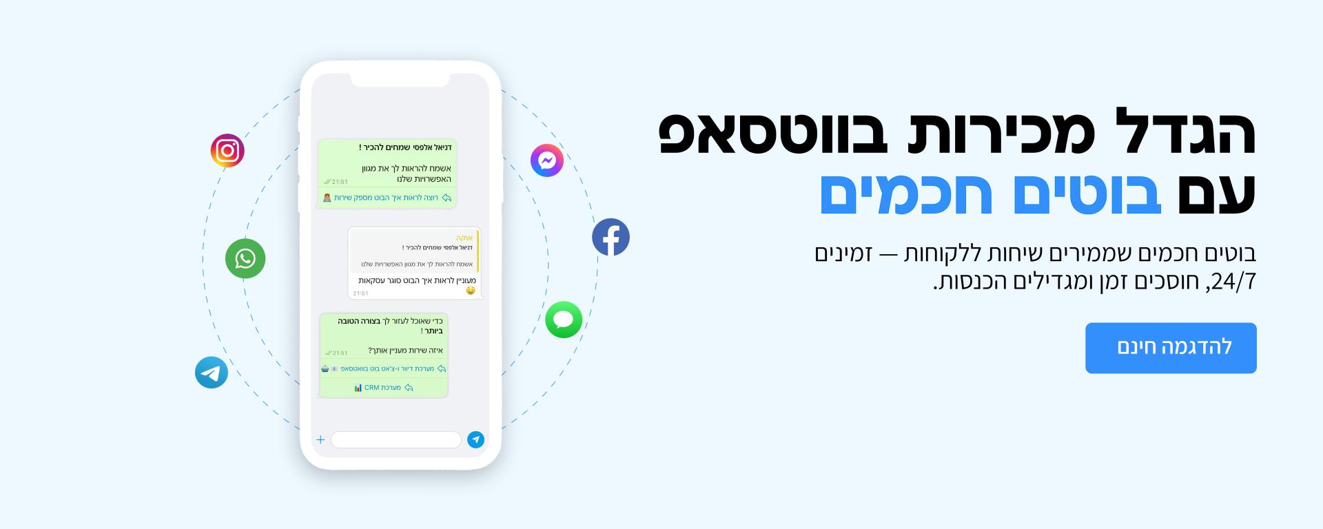 לא! StepUp נבנתה במיוחד לעסקים שצומחים – אין שום הגבלה על מספר ההודעות או הבוטים. אתה שולט במערכת באופן מלא ומרחיב את הפעילות שלך בקצב שלך.