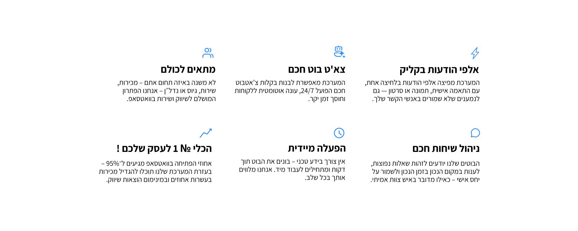 המערכת מתחברת ישירות לוואטסאפ העסקי שלך ומאפשרת לך ליצור בוטים חכמים שמנהלים שיחות אוטומטיות עם לקוחות. הבוט יודע לענות על שאלות, לתאם פגישות, לשלוח קבצים, ואפילו לשלוח הודעות חידוש לפני סיום מנוי